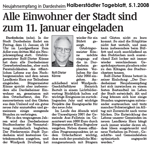 | 13.01.2014 | 9. Dardesheimer Neujahrsempfang im Zeichen erneuerbarer Energien siehe Presseartikel |