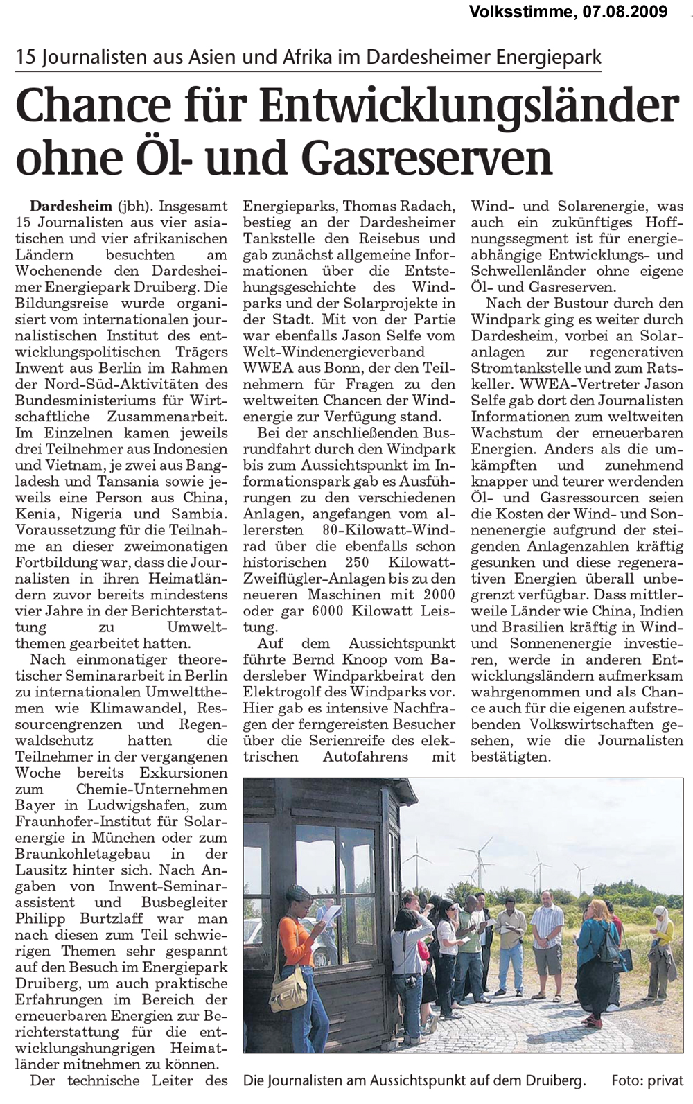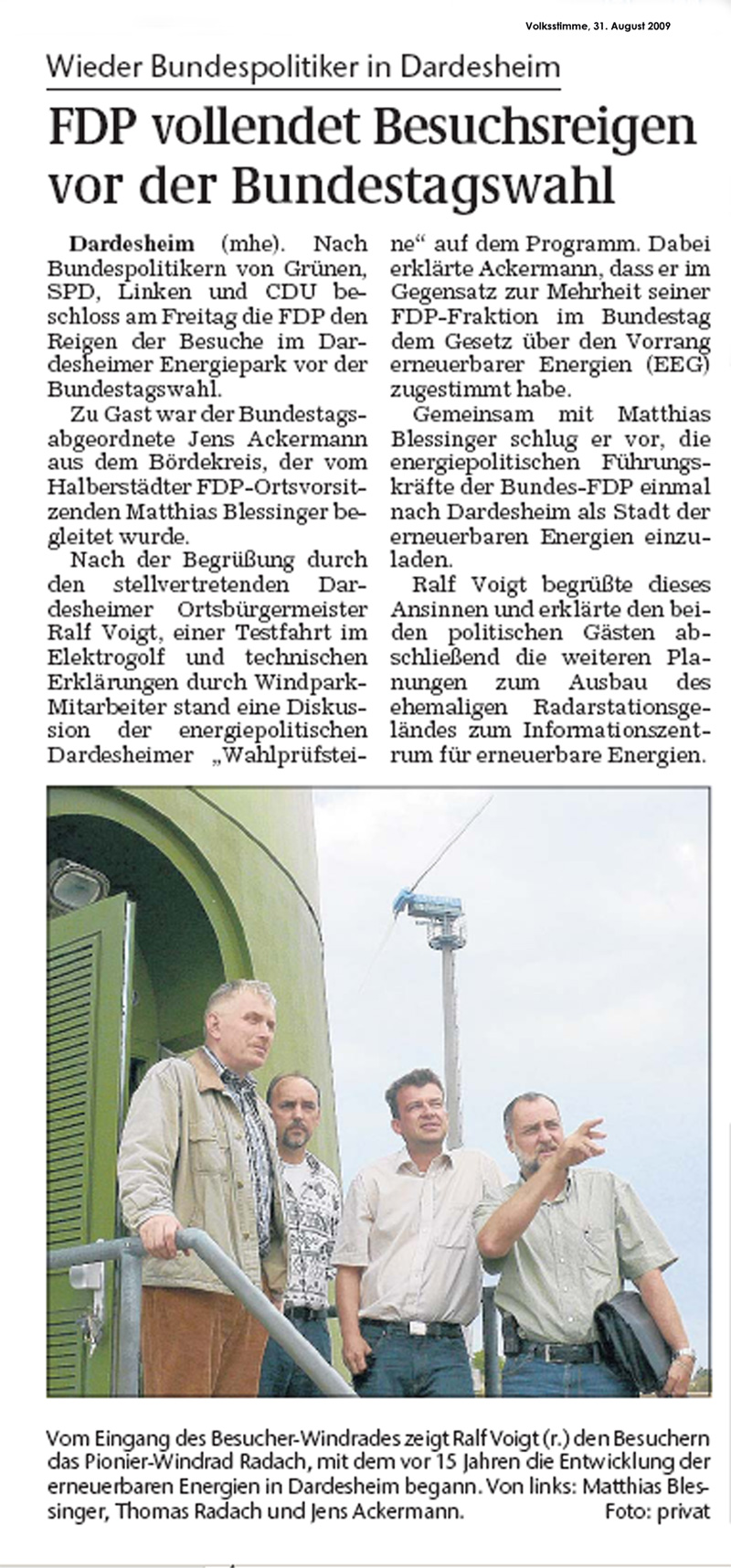 | 16.05.2007 | Mario Heinicke, Journalist der „Volksstimme“, interviewt Rolf-Dieter Künne, Bürgermeister von Dardesheim, anlässlich der vielen internationalen Gäste im Energiepark. siehe Presseartikel |