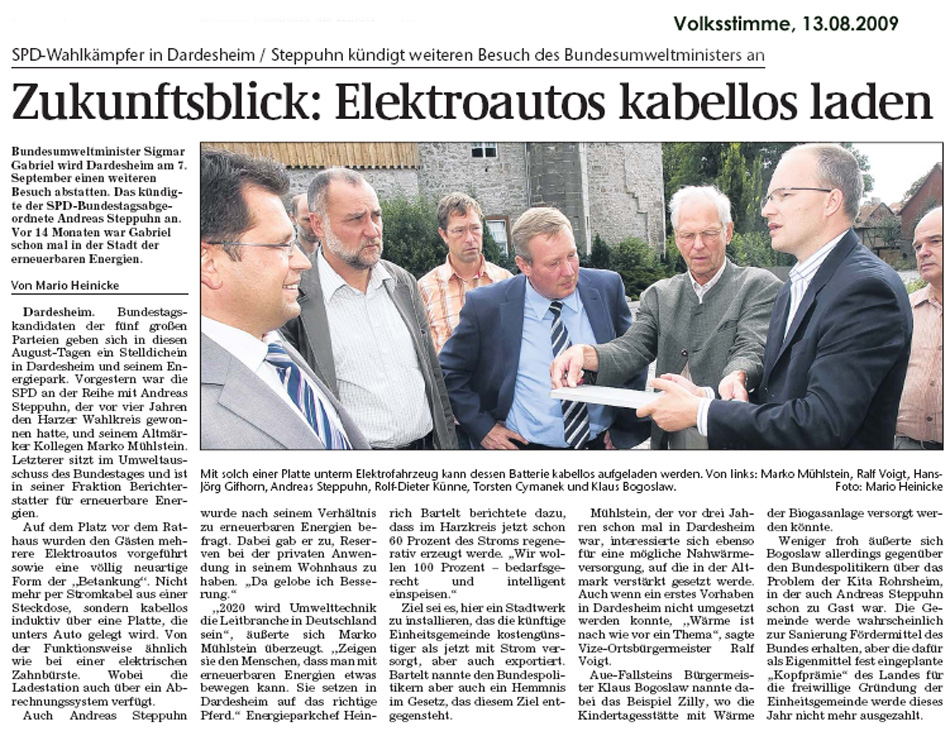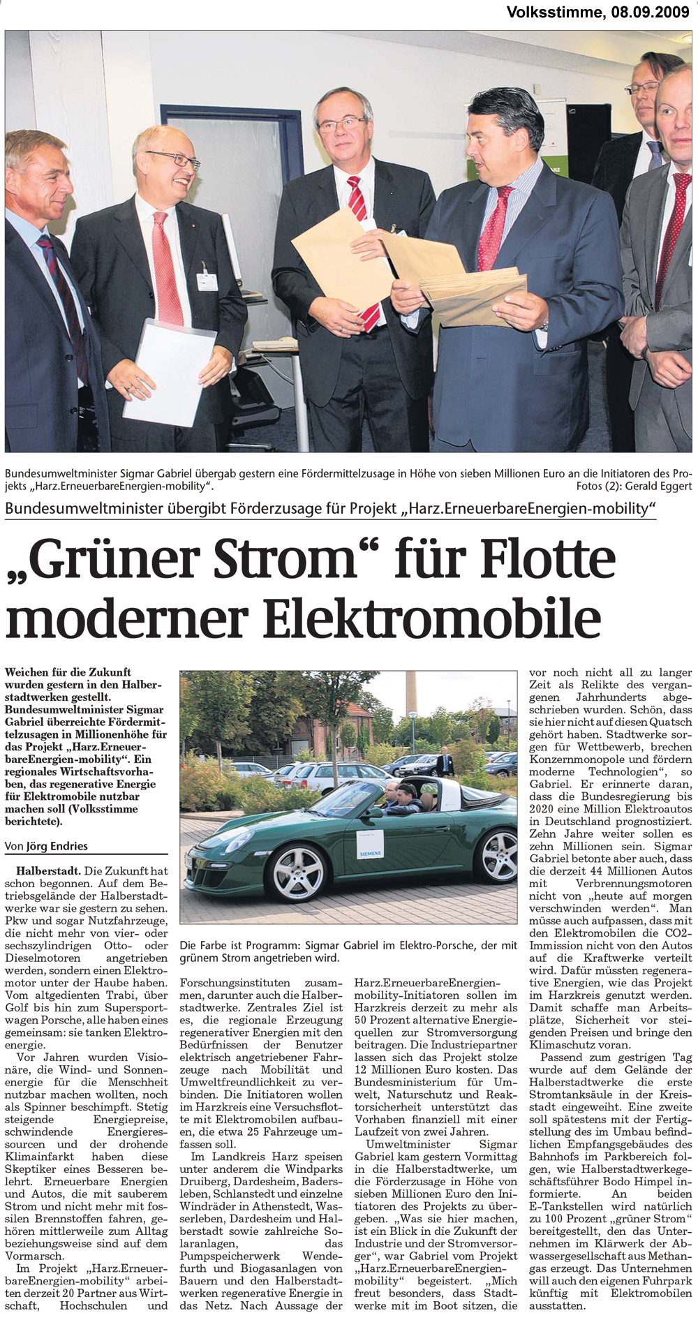 | 07.09.2010 | Forschungsvorhaben gestartet – 20 E-Mobile im Landkreis Harz unterwegs. siehe Presseartikel |